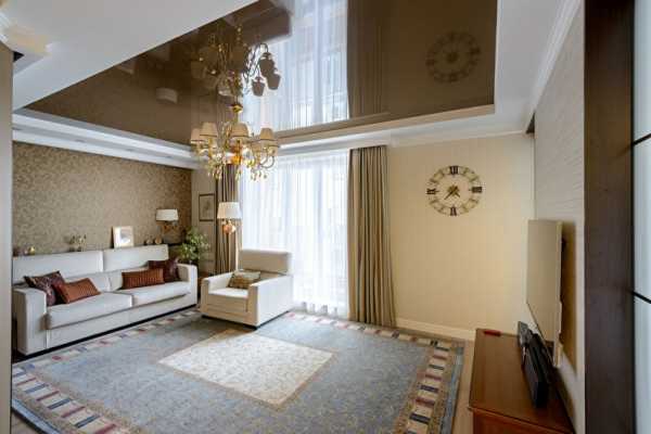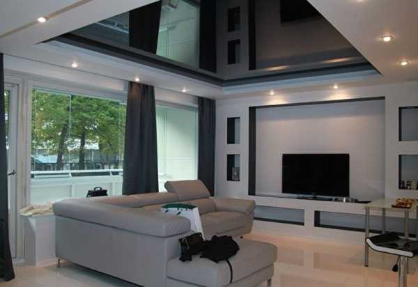 Двухуровневые натяжные потолки фото гостиной представлены далее