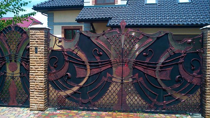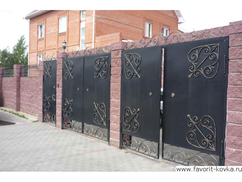 Фото гаражные ворота с элементами ковки: Кованые ворота, фото видов: с калиткой, откатные и распашные, с профнастилом, с виноградной лозой и другими элементами, худож…