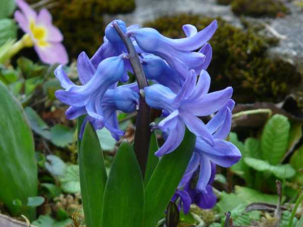 Красиво смотрятся одиночные гаицинты вдоль дорожек, под постройками, у входа. Красиво смотрятся растения-первоцветы около них.