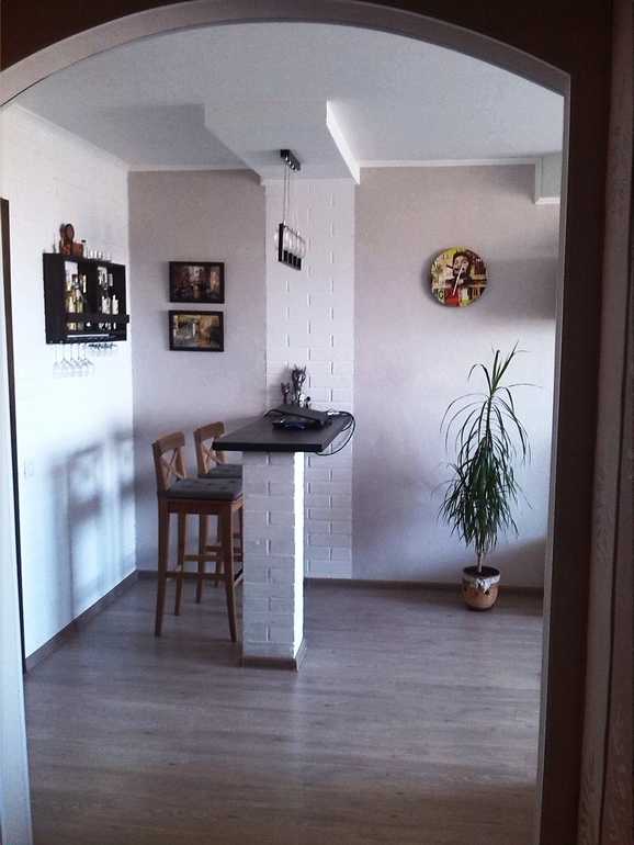 На потолке сделали довольно простые конструкции из гипсокартона, чтобы в каждой зоне комнаты было своё освещение и чтобы закрыть трубы отопления (объясню ниже где именно). На потолок поклеили ремонтный флизелин (похож на обои под покраску) и покрасили его в белый цвет. На полу снова ламинат, такой же как в прихожей (т.к. помещения соединены аркой, решили сделать пол одинаковым). На стенах обои под покраску - покрашены в серо-бежевый цвет, а на стенах возле барной стойки самодельный кирпич. Муж давно мечтал о барной стойке в квартире, поэтому делать ее решили обязательно, в кухне места для неё я не придумала, а вот в гостиной мне кажется она вписалась отлично, комната проходная и как раз угол был незадействован ничем. Напомню, что мебель вся с прошлой нашей квартиры (кроме барных стульев), поэтому отталкивались и от неё. В общем, смотрите сами (буду комментировать по ходу фотографий).Как обычно фото в процессе ремонта: ![]()
