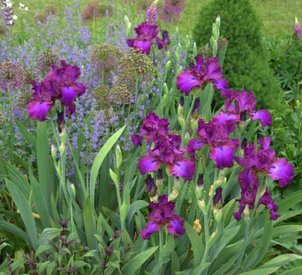 Ирисы цветут красивыми крупными цветками и соцветиями желтого, бледно-голубого и иных цветов. Преимущество этого цветка в том, что он способен цвести два раза за сезон: в конце весны и в начале осени.
