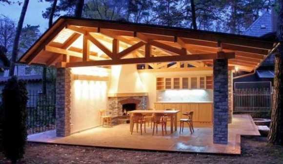 Обустройство незащищенного пространства выбирают по индивидуальным предпочтениям и исходя из архитектурной стилистики всего загородного комплекса. Важна планировка и крытого объекта, в которой необходимо учесть правильное расположение мангала, летней печи или иной устройства для приготовления пищи. Нужно помнить, что дым от печи не должен идти внутрь.