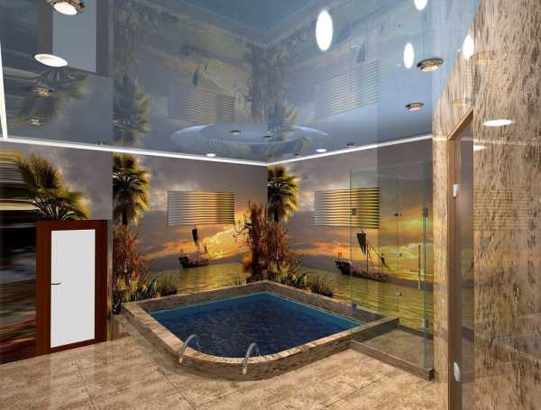 Вышеперечисленные примеры – это классические варианты. Но их можно дополнить еще одним элементом. После парной очень важно омываться водой. И для этого можно использовать не только тазы, ванные и душ. По возможности одну из комнат можно оборудовать под бассейн. Конечно же, для этого необходима значительная территория. Бассейн может быть бетонным, резиновым, полипропиленовым или пластиковым и иметь разборную, переносную или стационарную конструкцию. Может размещаться над поверхностью пола или быть встроенным в него.
