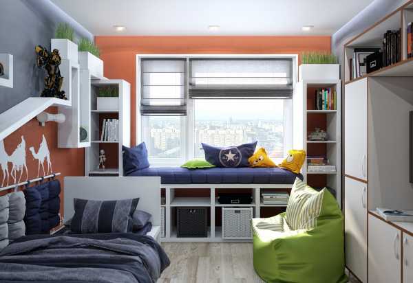 Не стоит заставлять небольшое помещение комодами, тумбами и прочим. В данном случае прекрасным вариантом будет встроенный шкаф и суперстильный книжный стеллаж. Если у Вас стены и потолок сделаны однотонными, только в таком случае можно использовать мебель разных цветов.