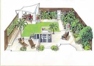 Возьмите в БТИ план вашего участка и перенесите его на миллиметровку в масштабе 1:100 (он наиболее удобен). Теперь расчертите весь участок на квадратики 1х1 см, где каждый квадрат будет соответствовать 1 м2 участка. Вооружитесь ножницами, цветными карандашами, бумагой и нарисуйте то, что запланировали создать на своём участке: дом, гараж, баньку, цветники, грядки и прочее. Вырежьте нарисованные фигурки. Передвигая их по плану, решите, где они станут располагаться, учитывая оценочные факторы участка и его стиль. План может выглядеть так:Определите ориентацию участка согласно сторон света. На южной запланируйте посадки. Для наглядности план можно сделать объёмным: из бумаги склеить глобальные постройки, а более мелкие вылепить из пластилина. Так вы увидите, куда станет отбрасывать тень ваш загородный дом или какое место участка постоянно находится на солнышке. Эти простые манипуляции в планировании дачного участка помогут избавиться впоследствии от многих недоразумений. А если вы владеете ландшафтными программами, можно сделать вот такую схему на компьютере.