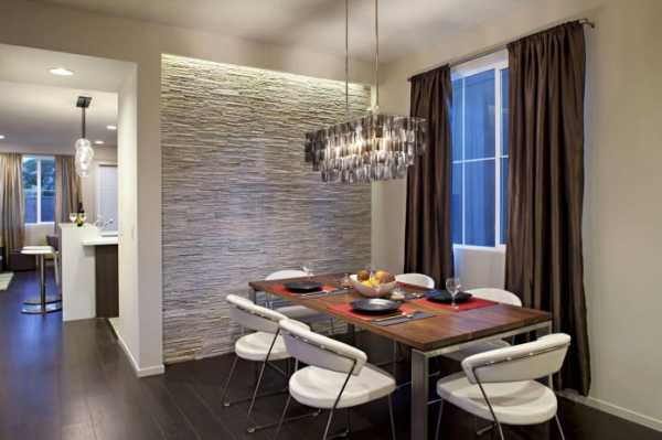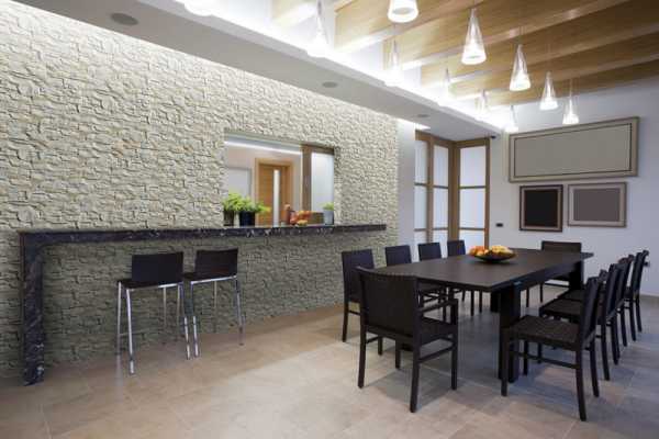 Стена возле обеденного стола с каменной отделкой — будет создавать ощущение комфорта и торжественности, превращая привычные трапезы в пиршества.