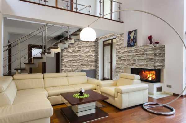 Камень в интерьере гостиной может быть менее прочным, чем для прихожей. Стена, двери, арка и камин ─ все это может быть оформлено каменной кладкой и делать гостиную более уютной. Камень в гостиной подойдет для загородного или частного дома.