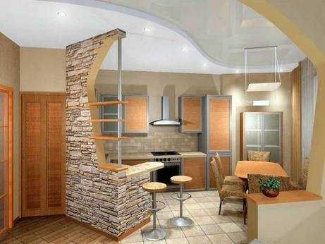 Камнем отделывают проемы дверей, ниши, часть стены, обеденную зону. Но стоит помнить, что камень должен сочетаться с гарнитуром, и соответствовать размерам помещения, если кухня небольшая, берите маленький камень, просторная — большой.