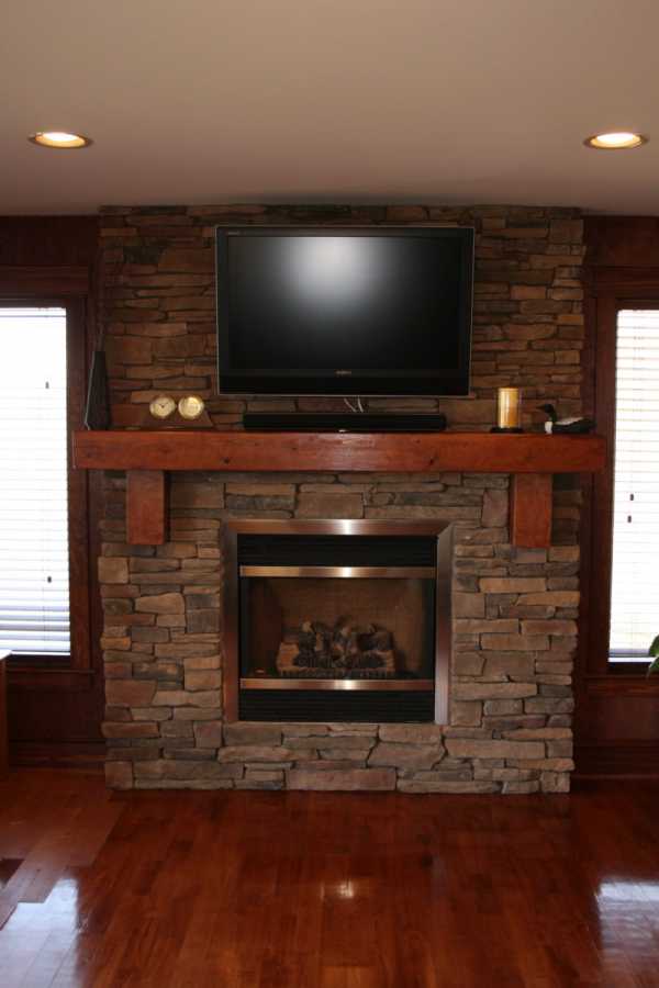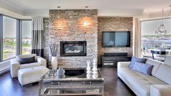 В случае отсутствия камина основное внимание уделяется телевизору. Камень выкладывается либо аналогичным образом, чтобы экран телевизора находился на его фоне, либо на голую стену, окруженную своеобразной каменной рамкой: