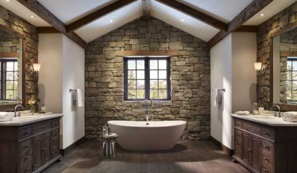 Деревянные рамы зеркал, балки под потолком и имитация булыжника создадут неповторимый дух в ванной.