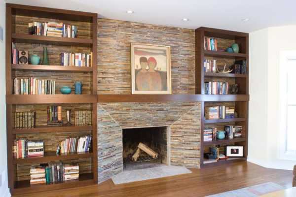 Камень идет на украшение стены возле стола, зоны стеллажа, а его жаростойкость позволяет отделать им камин и площадку перед ним.