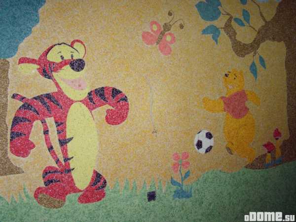 На стену с жидкими обоями легко наносить рисунки, если дизайн предусматривает. Но предварительно изображение делают карандашом или маркером прямо на отделочном материале. Только после этого переходят к нанесению жидких обоев. Делают это строго по линии. Движения идут от центра к его краям.