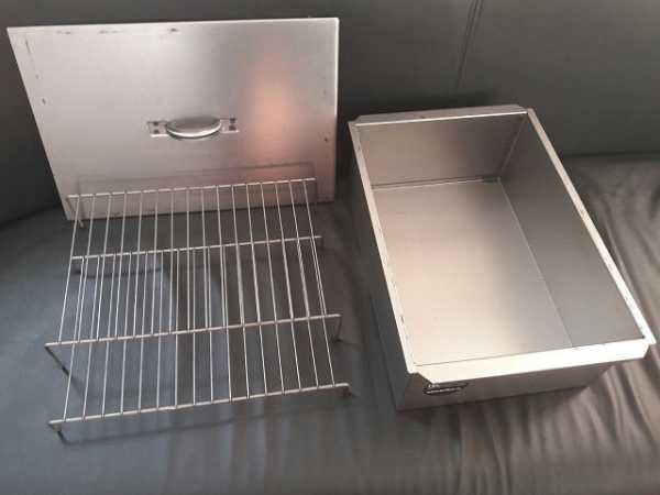 Инструкция по изготовлению коптильни такого вида очень проста. Из листовой нержавеющей стали следует собрать конструкцию в виде ящика. Все швы свариваются, а внутрь привариваются уголки на двух уровнях. На уголки будут ставиться решетки для размещения продуктов.
