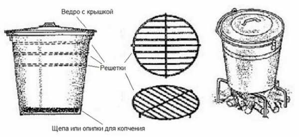 Для изготовления такой мини-коптильни применяют старые ведра из стали. В ведро устанавливают две сетки, изготовленные из нержавейки. Первую размещают на расстоянии в десять сантиметров от дна, а вторую через пять сантиметров после первой.