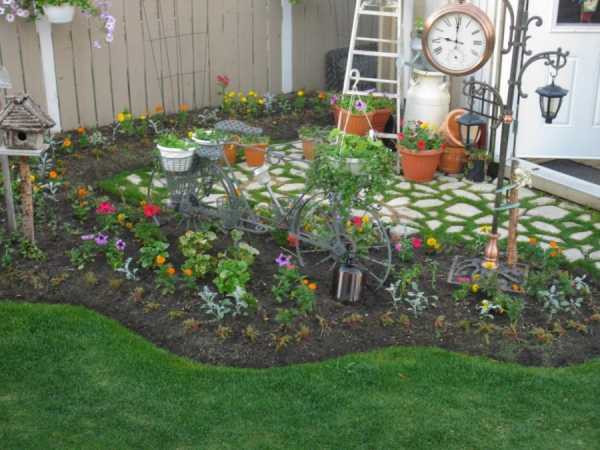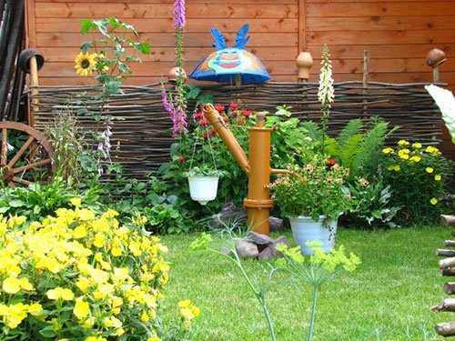 Кто сказал что дача – это исключительно грядки? Кроме них можно сделать отличную клумбу, использовав при этом старые ненужные ёмкости. Все что потребуется – это наличие таких предметов, как лейка, миска, кастрюля, или что-то такого рода. Можно использовать и более габаритные вещи, к примеру, тележку или тачку.