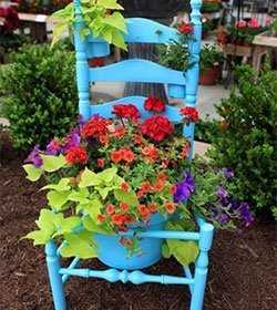 Изящный стул с цветами своими рукамиТакой стул станет декоративным оформлением, в которое можно высадить цветы, просто предварительно заменив сидение обычной плошкой или геотекстилем, при этом наполнив их хорошей питательной почвой. Рекомендуется в таком варианте декора высаживать цветы с небольшой корневой системой, можно даже несколько вьющихся вариантов, которые будут обвивать ножки или спинку стула.