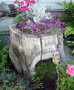 Достаточно оригинально будет смотреться композиция из дерева и цветов. Такая комбинация будет необычной, и придаст клумбе новый формат вида.