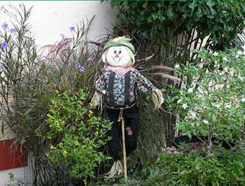 В сторонке от дома можно установить симпатичное чучело, сделанное в стиле Страшилы из «Волшебник из страны Оз». Его можно облачить в старую одежду, голову сделать из старой белой наволочки и раскрасить, в качестве набивки подойдут ненужные лоскутки или простая солома. Нарисуйте пугалу смешную рожицу и установите. Смотрится очень забавно.