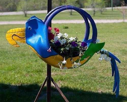 А как вам такая зверушка, которая поселиться на вашем дачном участке? Очень милая вещичка для декора, к тому же можно сделать её самостоятельно своими руками. Всё что нам потребуется – это пластиковая бутылка и немного фантазии. В нём также можно сделать клумбу, либо посадить рассаду, газонную траву, прочее. Важным плюсом будет тот факт, что такая чудо-клумба является мобильной, и её можно переносить в любую часть дачного участка. Больше поделок для красивой дачи из пластиковых бутылок своими руками.