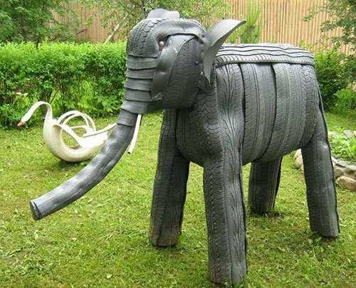 Кстати, этот веселый и яркий попугай сделан из старой шины, кто бы мог подумать, что из ненужных материалов можно изготовить такую красоту! А вот и слоник…