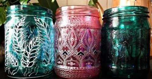 Как приятно вечером посидеть в беседке или на террасе, любуясь закатами солнца. Дружеские посиделки могут и затянуться, но ведь далеко не всегда хочется сидеть под светом электрических лампочек, ведь своими руками можно сделать такие оригинальные фонарики, внутрь которых помещаются свечи, наполняющие атмосферу романтикой и волшебством. Основой фонариков становятся стеклянные или жестяные банки. На жестяную банку наносят орнамент фломастером, а затем при помощи разных гвоздей и молотка выбивают его. Из проволоки приделывается ручку, на которой и будет висеть банка. Окрасить можно в любой цвет, а внутрь поместить свечу – через ажурный узор свет будет литься мягко, при этом подчеркивая красоту светильника. Изготовить светильники можно и из стеклянных прозрачных банок, окрасив их и декорировав бусинами, пуговицами, перьями и прочими подручными материалами.
