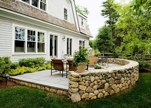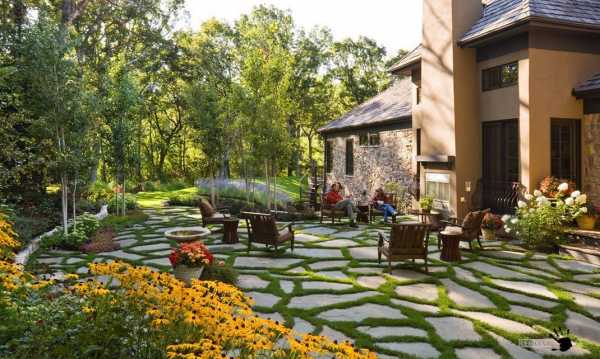 Возвращаясь к идеям патио и площадок для отдыха можно вдохновиться вот этим вариантом, я сделала фото через забор в одной из своих поездок. Владельцы дачи создали полукруглую клумбу, в центре замостили пространство камнем, и расставили обрезки деревьев в качестве сидений. Между клумб пространство дачи просто засеяно газонной травой.