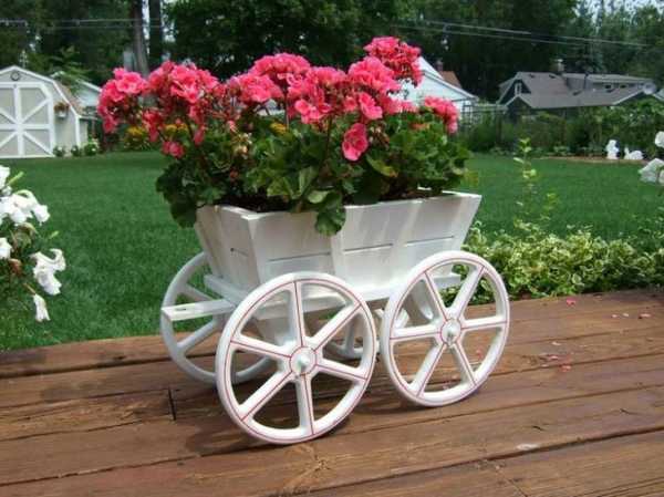Оригинальная клумба в тележкеИ так, когда мы остановили свой выбор на той или иной посудине, всё что останется – это насыпать в неё немного земли и посадить цветы.