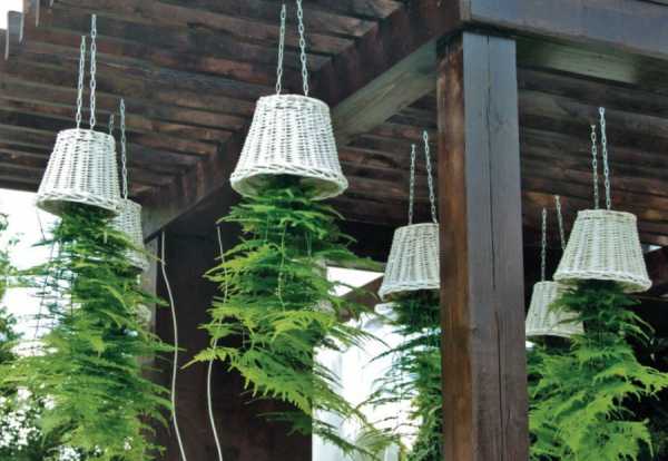 Оригинальная идея оформления дачи — использование ампельных растений. По мере отцветания тех или иных кадок, композицию можно менять. На фото показан пример размещения ампелей на перилах крыльца. Также кашпо можно развесить на верхних балках беседок или веранд.