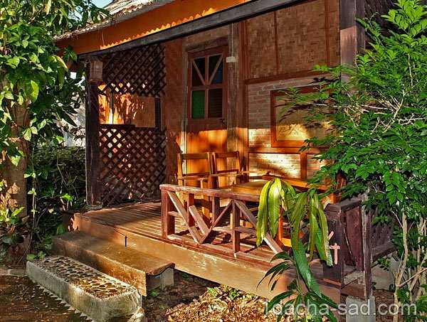 Пример оформления входа на южную сторону — терраса с крышей защищает большие окна до пола от проникновения солнечных лучей. Рядом с окнами витринами расположены кресла — качалки для отдыха.