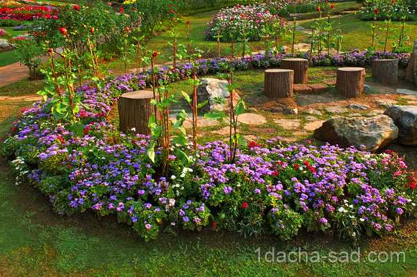 Клумба оформлена с помощью камняОдна из идей – это использование камня в качестве дачных дорожек. Если вы воспользуетесь таким вариантом, то наверняка в конце работы у вас останется достаточно битого отходного материала, который используетсяя вторично. С помощью него можно красиво выложить бортики грядки любой высоты. Если вы чувствуете в себе немного дизайнерских умений, попробуйте выложить из камня чашку, вазу или корзинку, которые в дальнейшем нужно будет засадить цветочками.