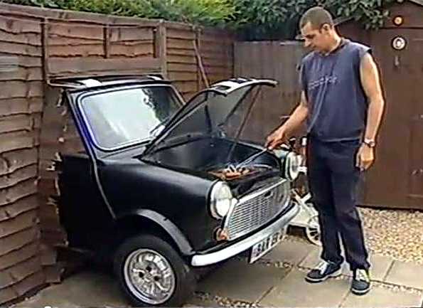 Оригинальные мангалы в виде машины являются частью общего замысла дизайнера при оформлении сада. Открытый капот, а в нем — жаровня с углами: идею можно обыгрывать в современном или ретро-стиле. Устанавливают конструкцию у стены, и машина как будто «выглядывает» из гаража.