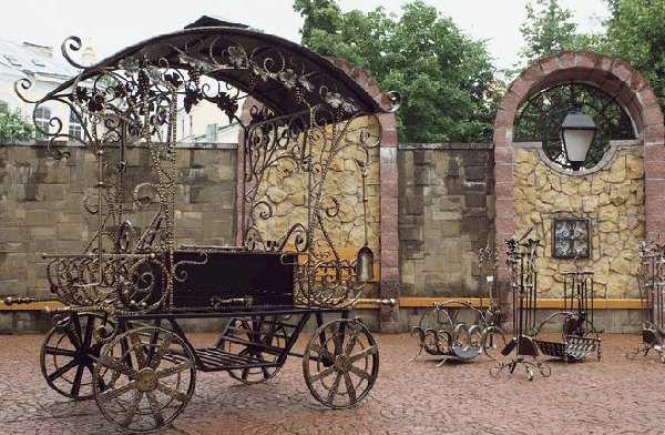 Металлические или чугунные мангалы для стационарной установки декорируют коваными элементами, это делает изделия более изящными, они смотрится эффектнее. Для стационарных конструкций берут толстые листы жаропрочной стали, жаровню снабжают ребрами жесткости, чтобы изделие служило не один сезон. Один из мангалов этого вида на фото ниже.