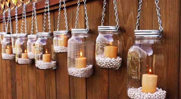 В вечернее время красиво смотрятся разные фонарики на заборе. Их тоже реально сделать самостоятельно из подручных материалов. Или можно просто в разрисованные стеклянные банки, прикрепленные к ограждению, поместить свечи. Главное, чтобы пламя не попадало на забор.