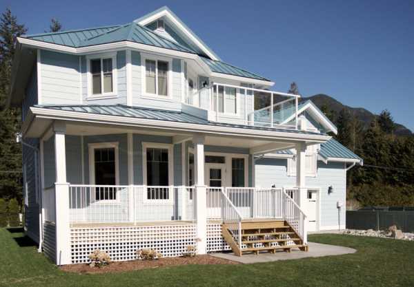 Фальцевые крыши с матовым покрытием серого цвета неплохо гармонируют с деревянной архитектурой загородных домов в стилистике кантри. Выдержанная в едином цвете с фасадами, металлическая кровля на фото выглядит очень удачно, а необходимые акценты в архитектуру усадьбы вносят белые колонны и оконные обрамления.