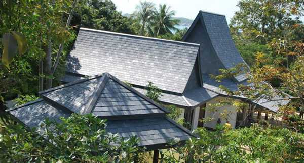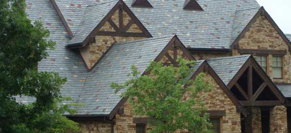 Многощипцовая кровля может быть выложена как колотым сланцем природной формы, так и геометрически правильными модулями прямоугольной конфигурации.