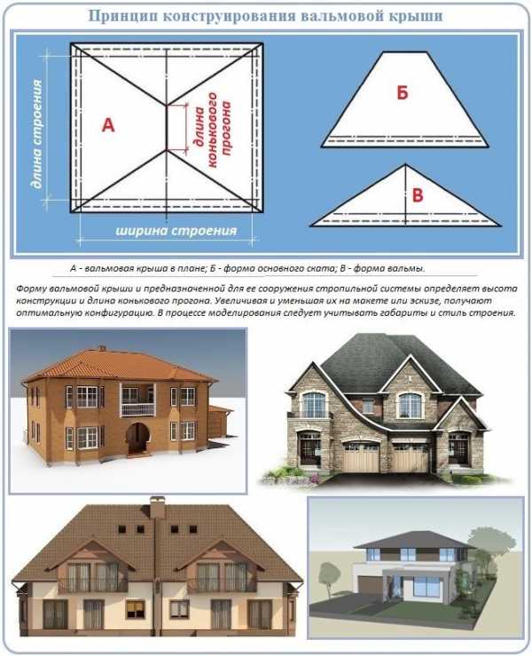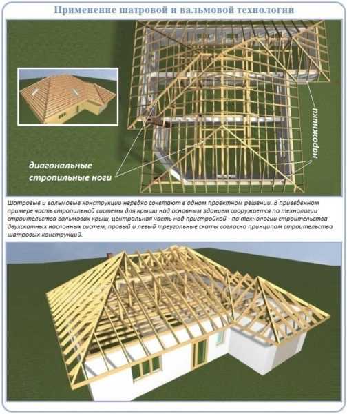 Четырехскатные крыши между собой объединяет конструкция, напоминающая конверт. Его можно увидеть на фото. Только прямоугольная форма этого конверта определяет вальмовые крыши, а шатровым конструкциям присуща квадратная форма конверта. Однако независимо от того, что форма кровли может быть квадратной или прямоугольно-продолговатой, ее каркас изготовляют из висячих и наслонных стропил.