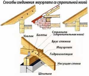- Промежуточный каркас скрепляется с мауэрлатом. Для этого необходимо применять обратную скобу. Угловые стропильные ноги следует упирать на мауэрлат, а другая сторона должна располагаться на диагональной ноге.
