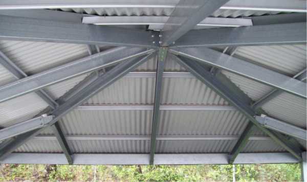 - Высокая жесткость конструкции обеспечивается наличием угловых ребер, сходящихся к опорной балке конька.