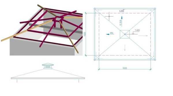 Совет! В зависимости от планировки шатровую конструкцию изготавливают из наслонных или висячих стропил. Но если угол уклона скатов больше 40о, желательно монтировать висячий тип стропил.