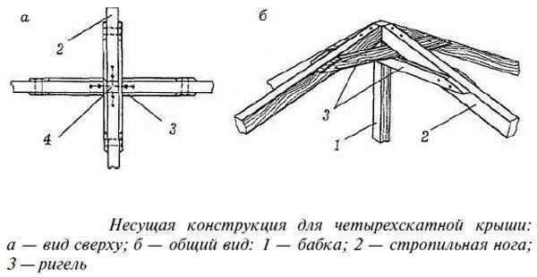 Сверху к стойке, а снизу к мауэрлату крепят ноги центральных стропил. Все соединения делают металлическими накладками и уголками. От верхушки опоры к четырем углам мауэрлата натягивают шнур и по нему устанавливают накосные ноги. Верхнее крепление у конька выполняют двойной врезкой. На свесы прибивают гвоздями ветровую доску. При надобности монтируют подкосы и ригели.
