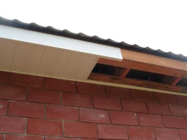 Следующими крепят нарожники. Если они имеют упор на выносные балки, для прочности под них устанавливают стойки. Это уменьшит нагрузку. Подшивку карнизов выполняют доской, но можно использовать влагостойкую фанеру.