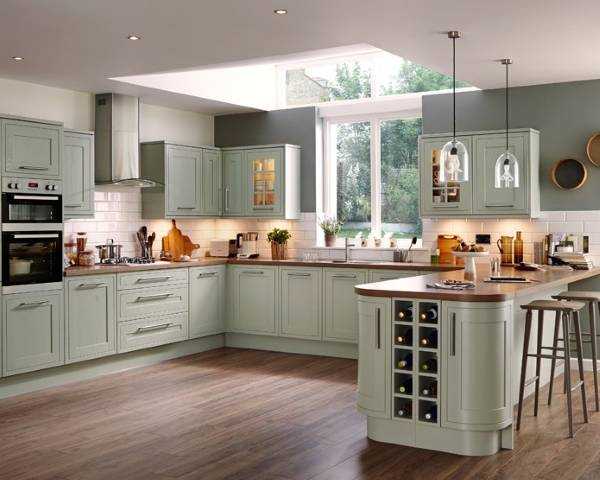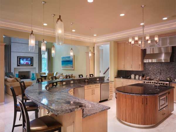На фото примерах можно увидеть, что планировка угловой кухни предусматривает большой остров посередине помещения.
