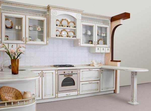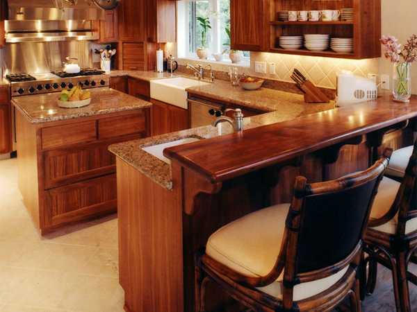 Опытный дизайнер сможет умело вписать барную стойку в интерьер угловой кухни любого стиля, будь то классика, прованс, модерн.