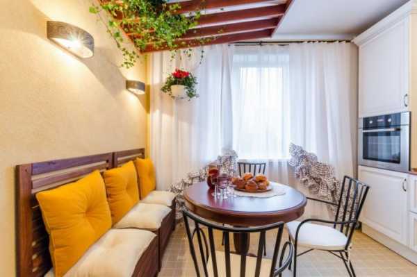 Другой пример — прямоугольная кухня площадью 6 кв.м. Деревянный стол стоит перпендикулярно окну, а скамья заметно шире, чем столешница — она вообще на всю ширину этой маленькой кухни. Так стол можно отодвинуть от окна и усадить до семи гостей.