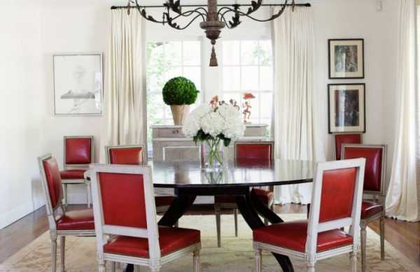 Обеденная группа может быть интерьерной доминантой, при этом для нее выбирается контрастный и достаточно яркий цвет. Например, при белых стенах и мебели стол может быть ярко-красным или оранжевым. Все зависит от выбранного стиля и вашего вкуса.