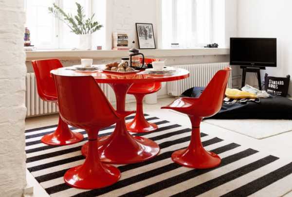 На фото круглый пластиковый стол красного цвета в интерьере кухни-гостиной.