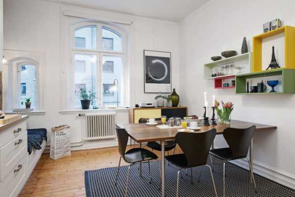 Идея из проекта: Если вариант со складными стульями (в качестве дополнительных) вас по каким-то причинам не устраивает, есть альтернатива: держать дополнительные стулья и табуреты в других комнатах. Например, владельцы этой небольшой квартиры иногда приносят на кухню стулья, которые стоят у письменного стола. Дизайнер Екатерина Плотниковаспециально предусмотрела такой сценарий: все модели разные по форме, но обивка у них одинаковая (во всей квартире).