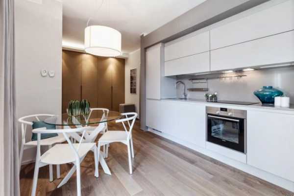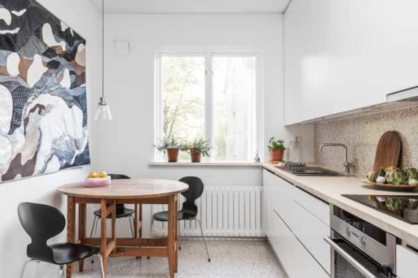 Барный столБарная стойка — вариант на любителя: если вы до этого пользовались обычным столом, к новой высоте придётся привыкать. Но на маленькой кухне такая стойка иногда становится единственным возможным решением. Например, в этом проекте дизайнер установил барную стойку поперёк кухни, у самой входной двери. Благодаря узкой столешнице удалось выиграть место для двух стульев родителям и одного детского — для кормления.Вся съемка этой квартиры 34 кв.м из Калининграда