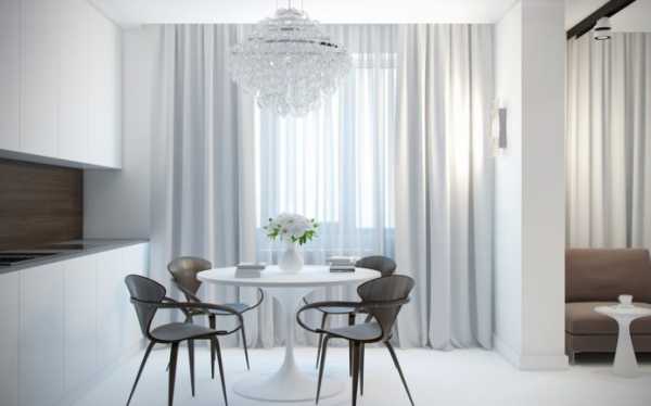 На фото круглый белый стол в интерьере небольшой современной кухни.