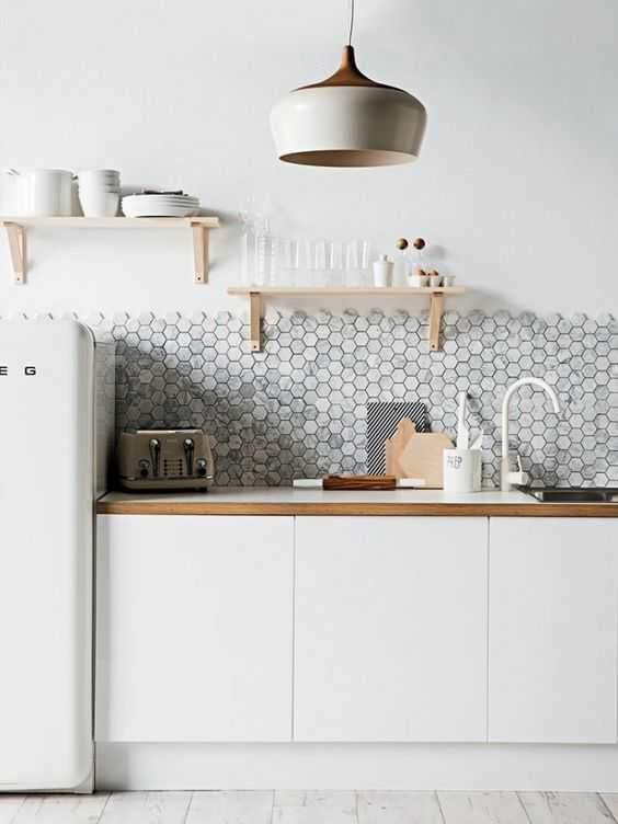 Но стоит отметить, что кафель очень хороший материал, красивый, долговечный и конечно же экологически чистый. Смотрите варианты отделки на фото. Очень интересный фартук для белой кухни или для светлых оттенков.